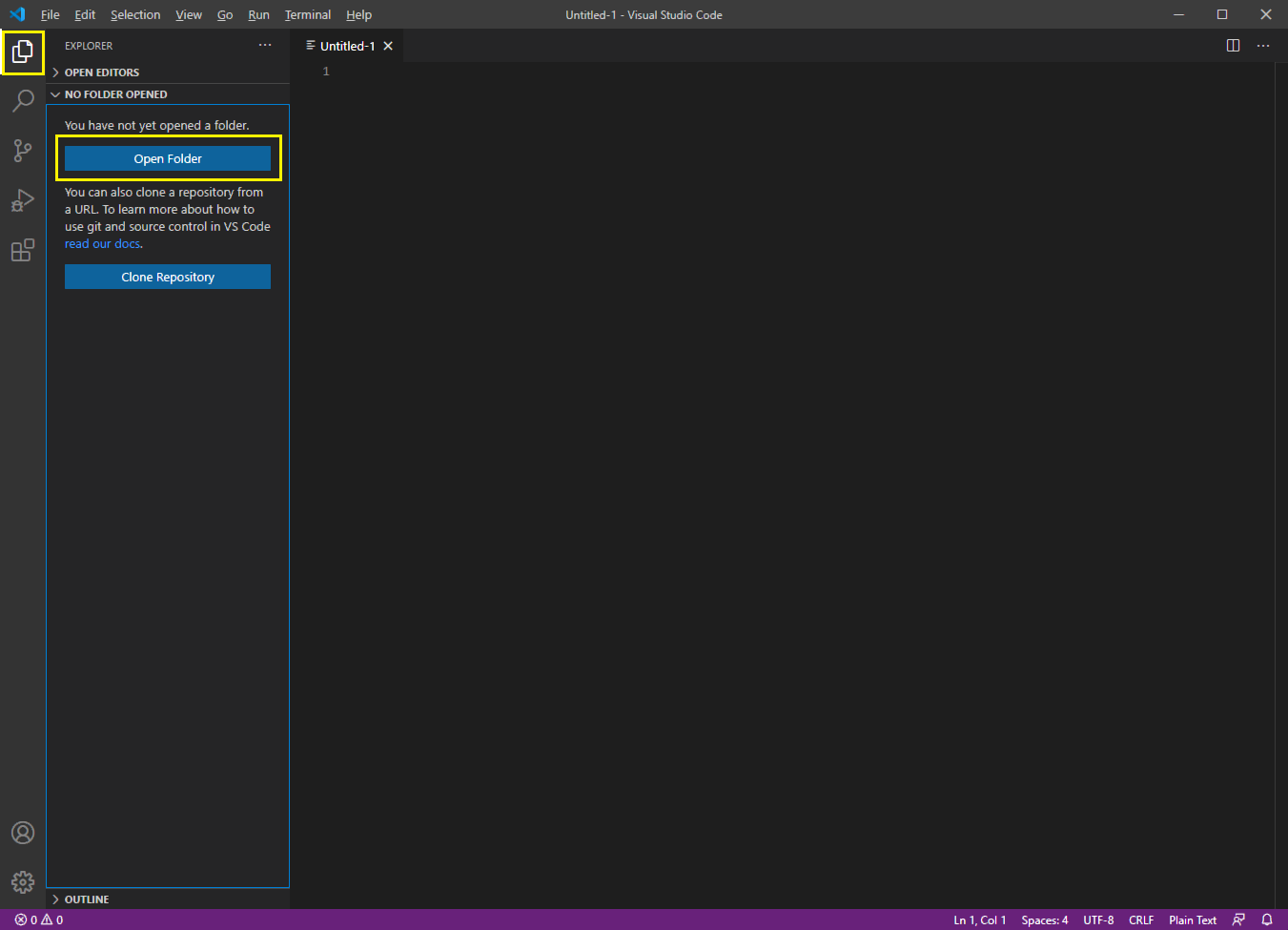 12. 좌측상단의 Explorer 아이콘을 클릭하고, Open Folder를 버튼을 클릭한다.