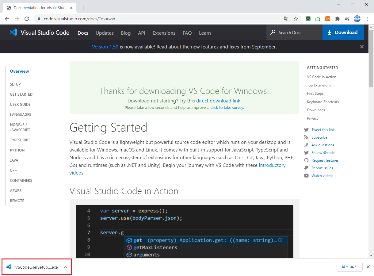 여기서 Windows 링크를 클릭한다. 새로운 창이 나타나면서 설치 파일의 다운로드가 시작된다. 다운로드가 완료되면 좌측 하단과 같이 설치 파일에 대한 정보가 출력된다.