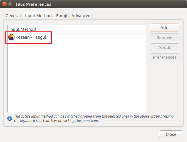 14. 아래와 같이 IBus Preference창이 출력된다. 여기서 Input Method 탭을 선택하고 Add 버튼을 클릭한다.