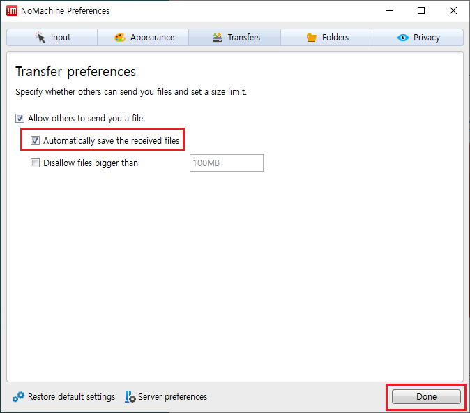 28. 원격 컴퓨터에 파일 전송이 필요한 경우 Transfers 탭에서 Allow others to send you a file 항목에서 Automatically save the received files를 체크하고 Done 버튼을 클릭합니다.