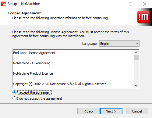 2. 다운로드한 설치파일(nomachine_6.12.3_7.exe, 버전에 따라 이름이 변경됨)을 실행하여 설치를 진행합니다.