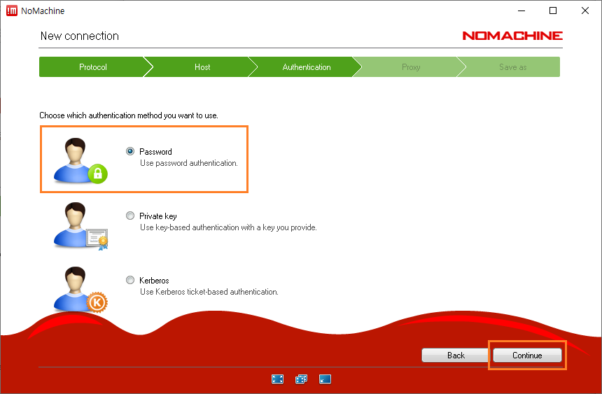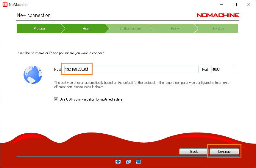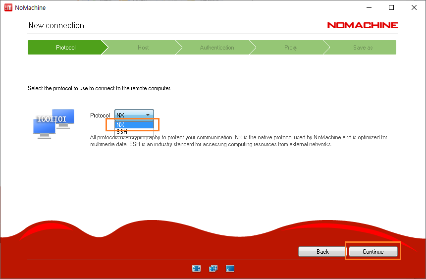 19. 먼저 프로토콜을 지정하는 창이 출력됩니다. NoMachine는 기본적으로 NX 프로토콜을 사용합니다. Continue 버튼을 클릭합니다.