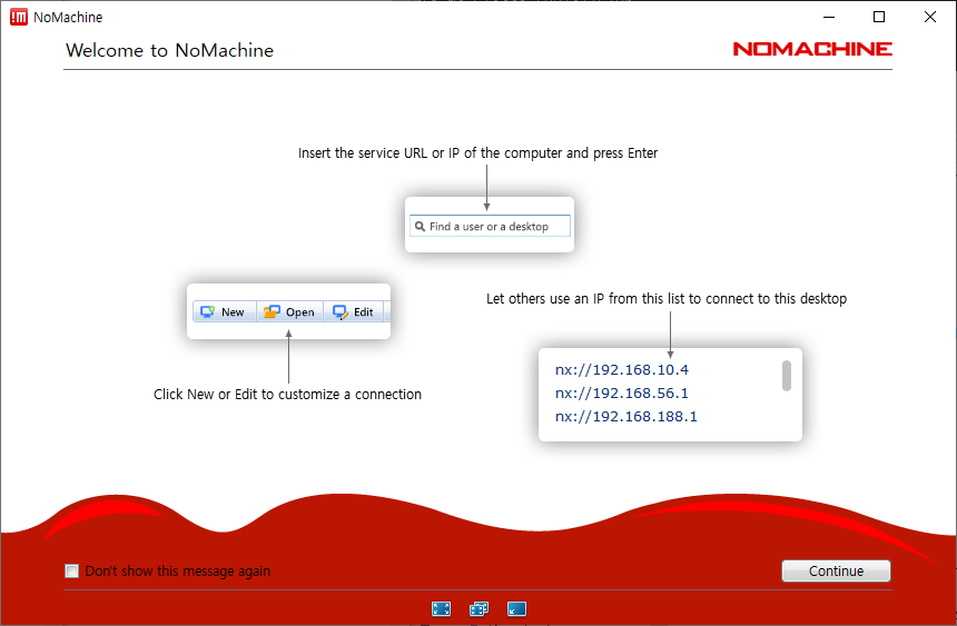 10. Continue 버튼을 클릭하여 초기 도움말 화면을 종료하고 메인 메뉴가 출력되도록 합니다. 메인 화면이 출력되면서 로컬 네트워크에 NoMachine Server를 자동으로 검색하여 아래의 그림과 같이 화면에 출력합니다.