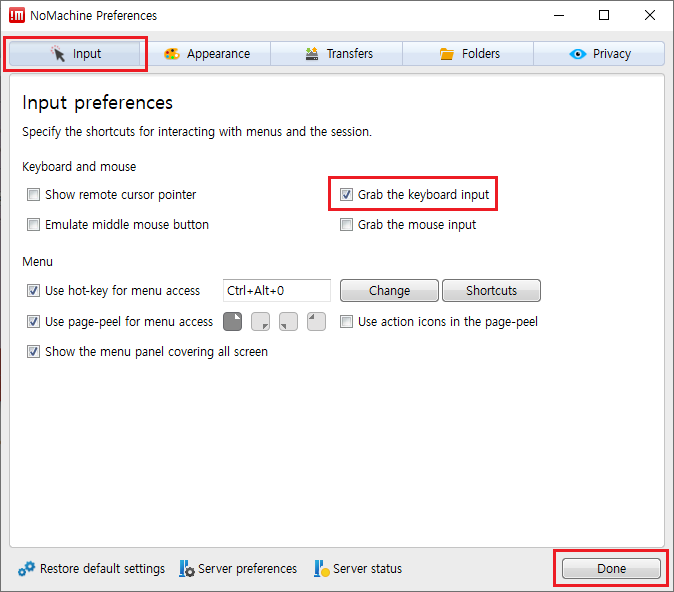 27. Input 탭을 선택하고, Keyboard and mouse 항목의 Grab the keyboard input을 체크합니다. 이 기능은 원격 컴퓨터에서 특수 키 입력을 지원하는 옵션입니다.