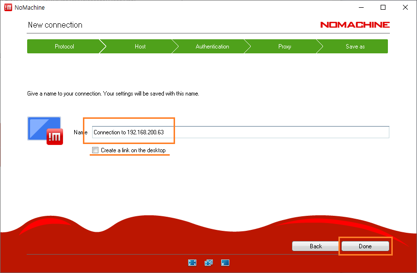 23. 설정한 연결 정보 이름을 입력합니다. 만약 바탕화면에 바로가기를 만들고 싶으면 Create a link on the desktop을 체크합니다. 마지막으로 Done 버튼을 클릭하여 설정 정보를 저장합니다.