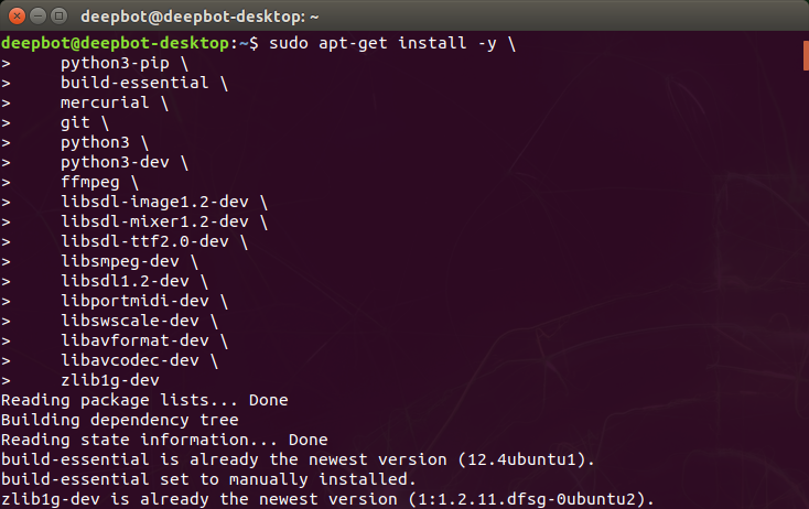 sudo apt-get install python-dev libsdl-image1.2-dev libsdl-mixer1.2-dev libsdl-ttf2.0-dev libsdl1.2-dev libsmpeg-dev python-numpy subversion libportmidi-dev ffmpeg libswscale-dev libavformat-dev libavcodec-dev libfreetype6-dev