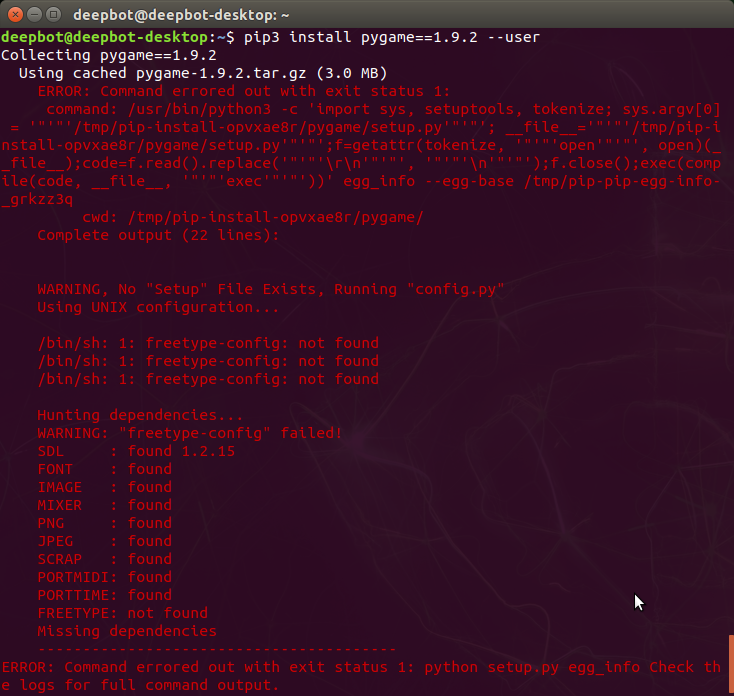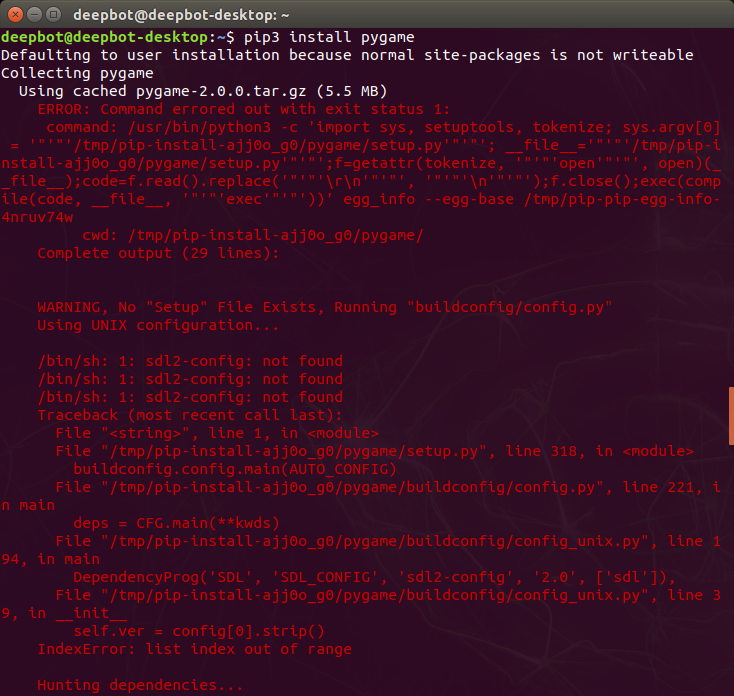 pygame 설치 시 위와 같은 에러가 발생할 경우 libsdl1.2-dev가 설치되어 있지 않았기 때문입니다.