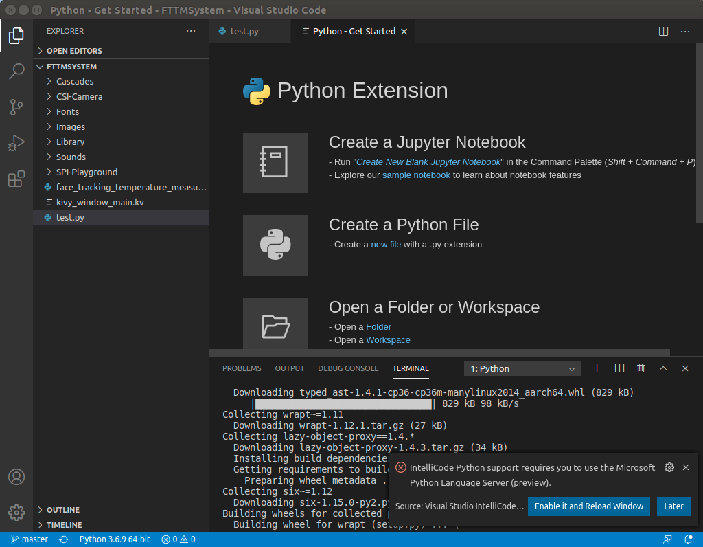 필요하시면 IntelliCode Python 지원도 Enable it and Reload Window 버튼을 클릭하세요. 2가지 설정이 완료되면 아래와 같은 창이 출력됩니다.