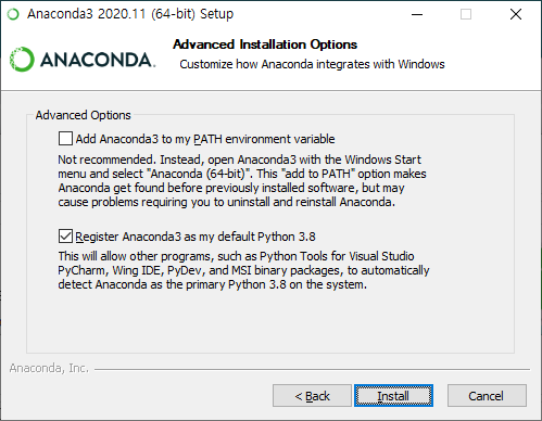 Register Anacoda as my default Python 3.8을 선택한 상태로 Install 버튼을 클릭합니다. 이 옵션은 PyCharm과 같은 개발 툴에 아나콘다에 포함되어 있는 Python을 사용하도록 등록하는 것입니다. 첫 번째 옵션을 선택할 경우 다른 프로그램들에 영향을 미칠 수 있기 때문에 체크하지 않습니다.