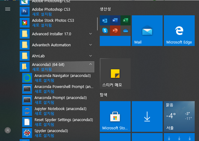 3. Anaconda 설치가 완료되면 윈도우 시작 버튼에서 Anaconda3(64-bit)를 확장하여 아래의 그림과 같이 정상적으로 설치되어 있는지 결과를 확인합니다.