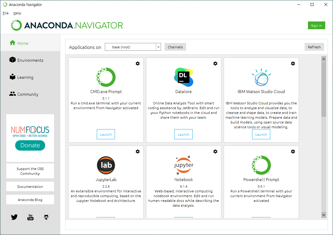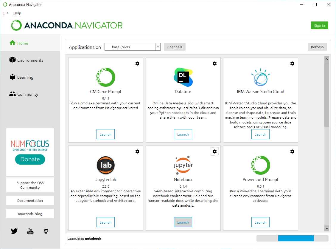 Home으로 이동하여 Jupyter Notebook의 Launch 버튼을 클릭합니다.
