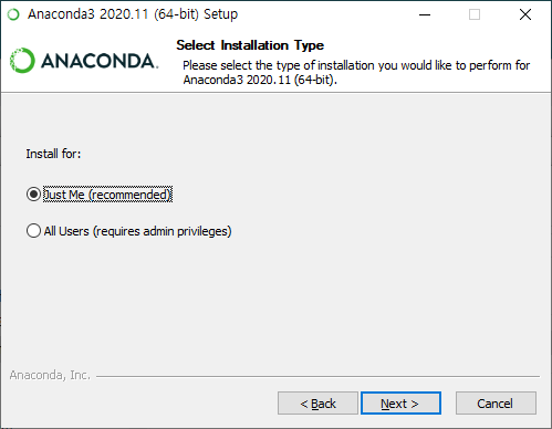 Just Me를 선택하고 Next 버튼을 클릭합니다. 만약 All Users를 선택하면 실행 시 Admin 권한으로 실행해야 합니다.