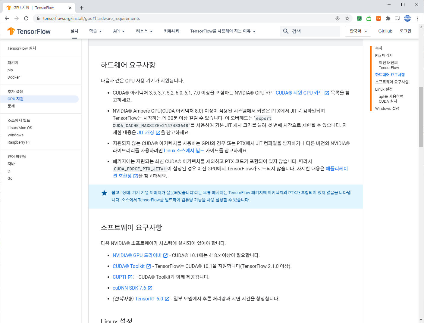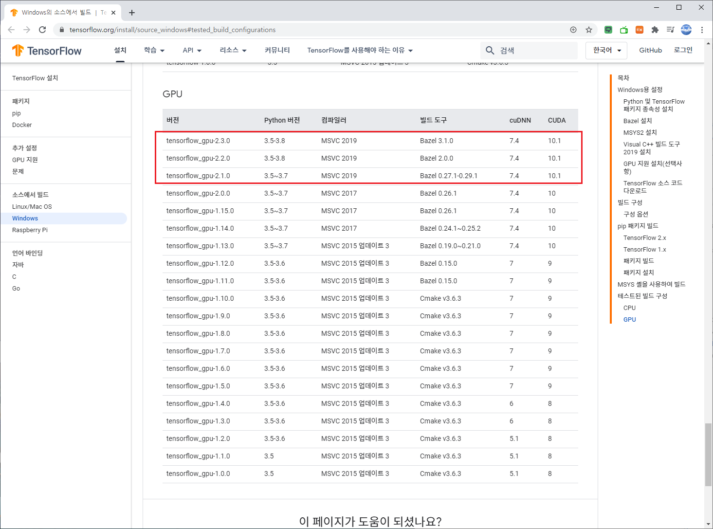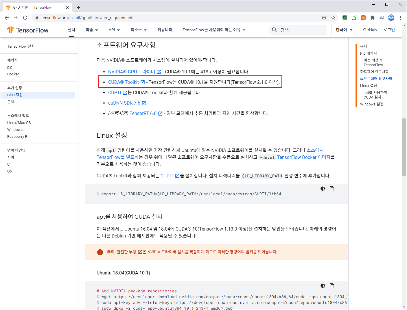다음은 Tensorflow 2.1.0 이상인 경우 CUDA 10.1을 지원한다고 되어 있습니다.