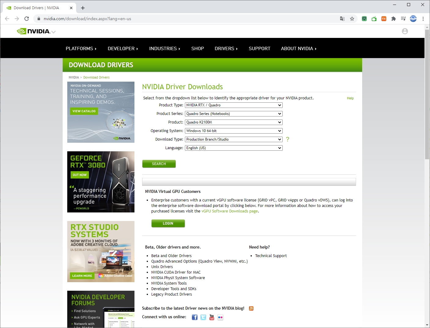 아래의 그림과 같이 컴퓨터에 설치된 비디오카드의 모델을 선택한 후 SEARCH 버튼을 클릭합니다.