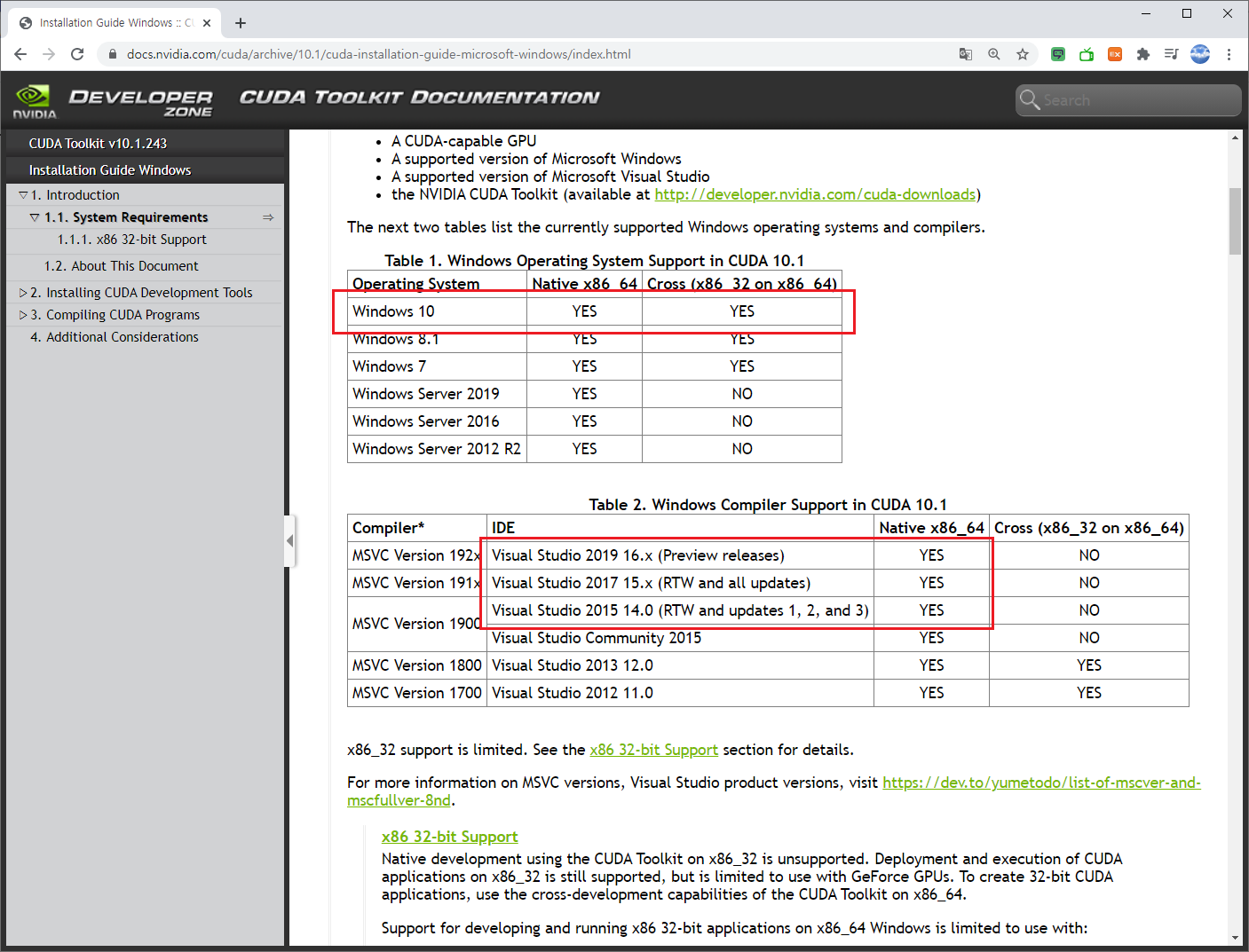 아래의 그림은 CUDA 10.1 버전의 경우 설치 가능한 OS와 MSVC 버전을 소개한 것입니다.