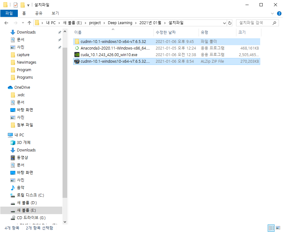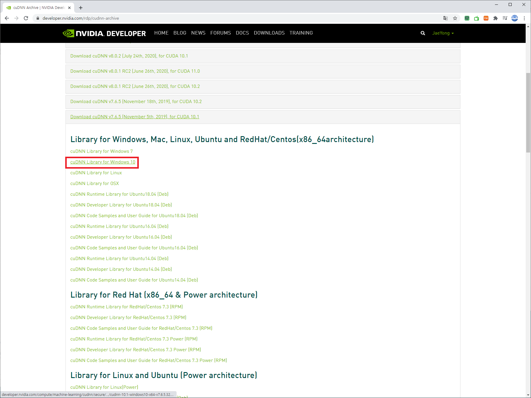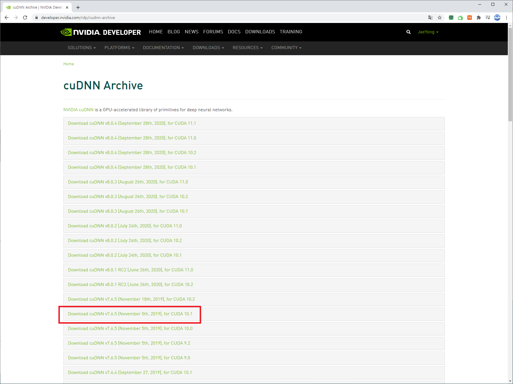 CUDA 10.1을 지원하는 cuDNN v7.6.5 링크를 클릭합니다.