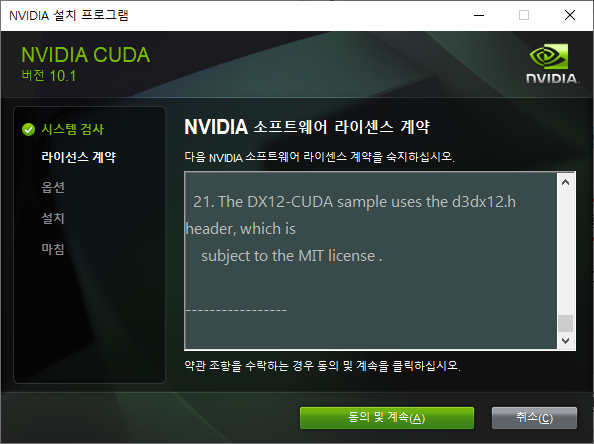 검사가 완료되면 라이선스 동의 창이 출력됩니다. 동의 및 계속 버튼을 클릭합니다.