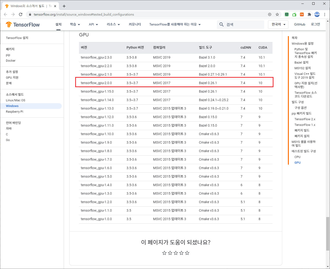 아래의 사이트에 접속하면 설치하고자 하는 Tensorflow gpu와 호환되는 CUDA, cuDNN 버전을 확인할 수 있습니다.