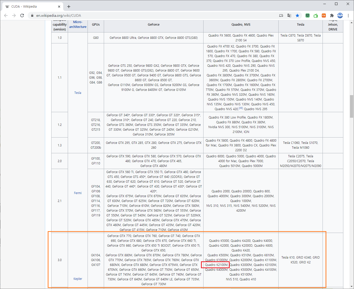 따라서 제 컴퓨터에 설치된 Quadro K2100M 비디오 카드의 계산능력은 3.0이고 이것을 지워하는 CUDA 버전은 10.0입니다. 또한 cuDNN은 7.4버전을 설치하고 tensorflow-gpu는 2.0 버전을 설치해야 합니다.