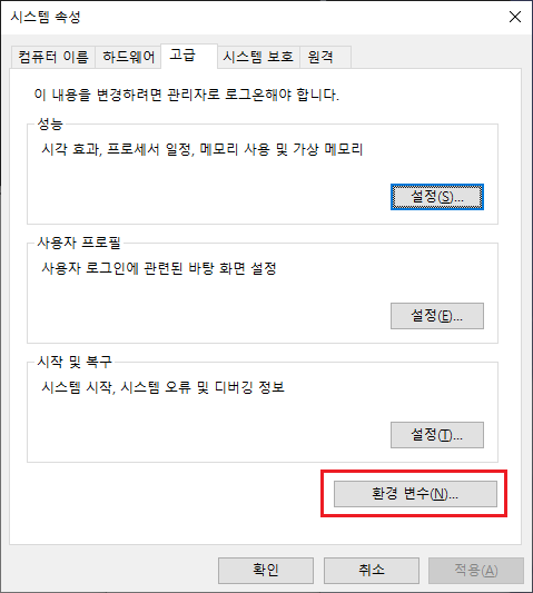 실행된 시스템 속성 창에서 "고급" 탭을 선택하고, "환경 변수" 버튼을 클릭합니다.