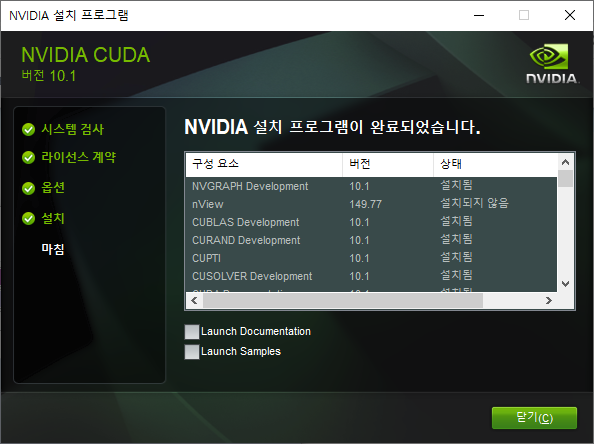"다음" 버튼을 클릭하면 아래아 같은 설치 완료 결과 화면이 출력됩니다. "닫기" 버튼을 클릭하여 설치를 완료합니다.