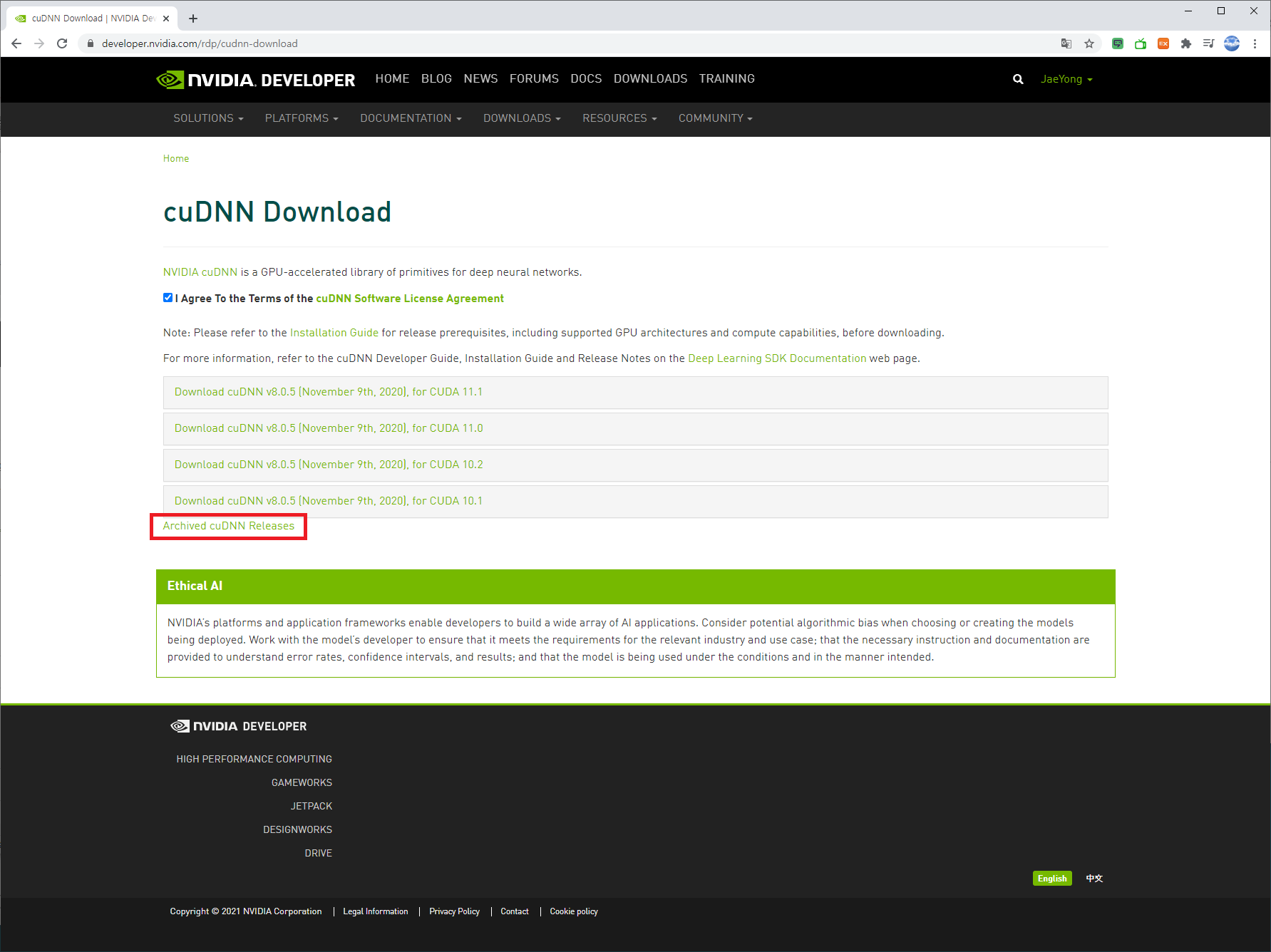 설문조사를 완료하면 다운로드 선택 페이지가 출력됩니다. 이 페이지에서 "Archived cuDNN Releases" 링크를 클릭합니다.