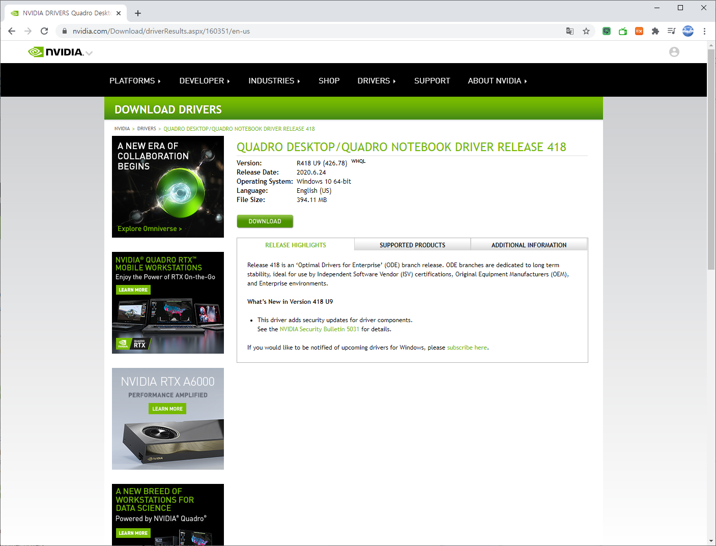 해당 비디오 드라이버 최신 버전이 검색되고 DOWNLAOD 버튼을 클릭하여 다운로드 후 설치하시기 바랍니다.
