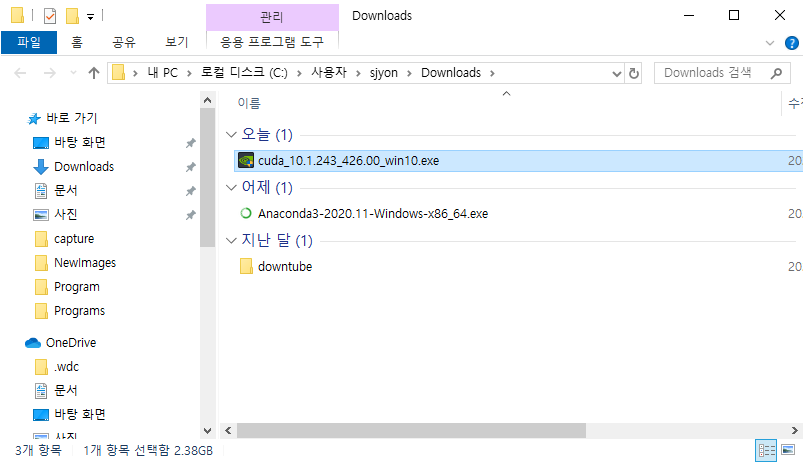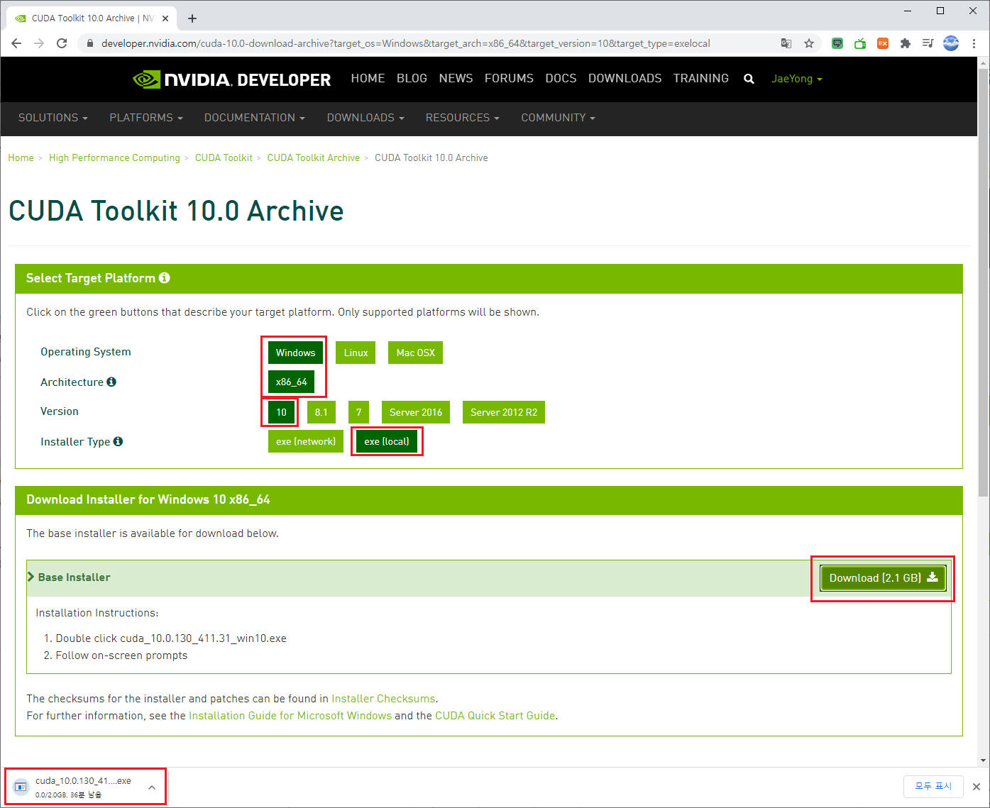 쳥ㅁ 10.0, CUDA 10.1을 설치합니다. 아래의 링크로 접속하여 CUDA를 다운로드합니다.