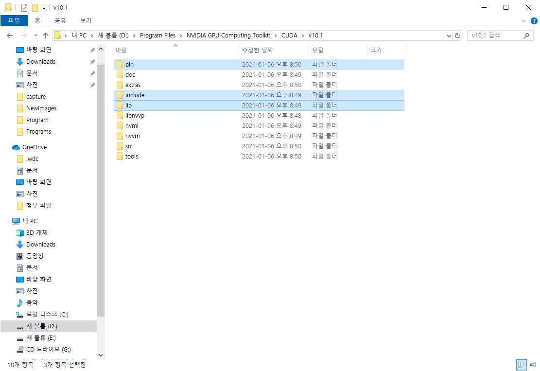 압축을 해제하면 cuda 폴더에 3개의 폴더가 존재합니다. 이 3개의 폴더(bin, include, lib)를 CUDA를 설치한 기존의 폴더( ...\CUDA\v10.1)에 그대로 복사하여 덮어쓰기를 합니다.
