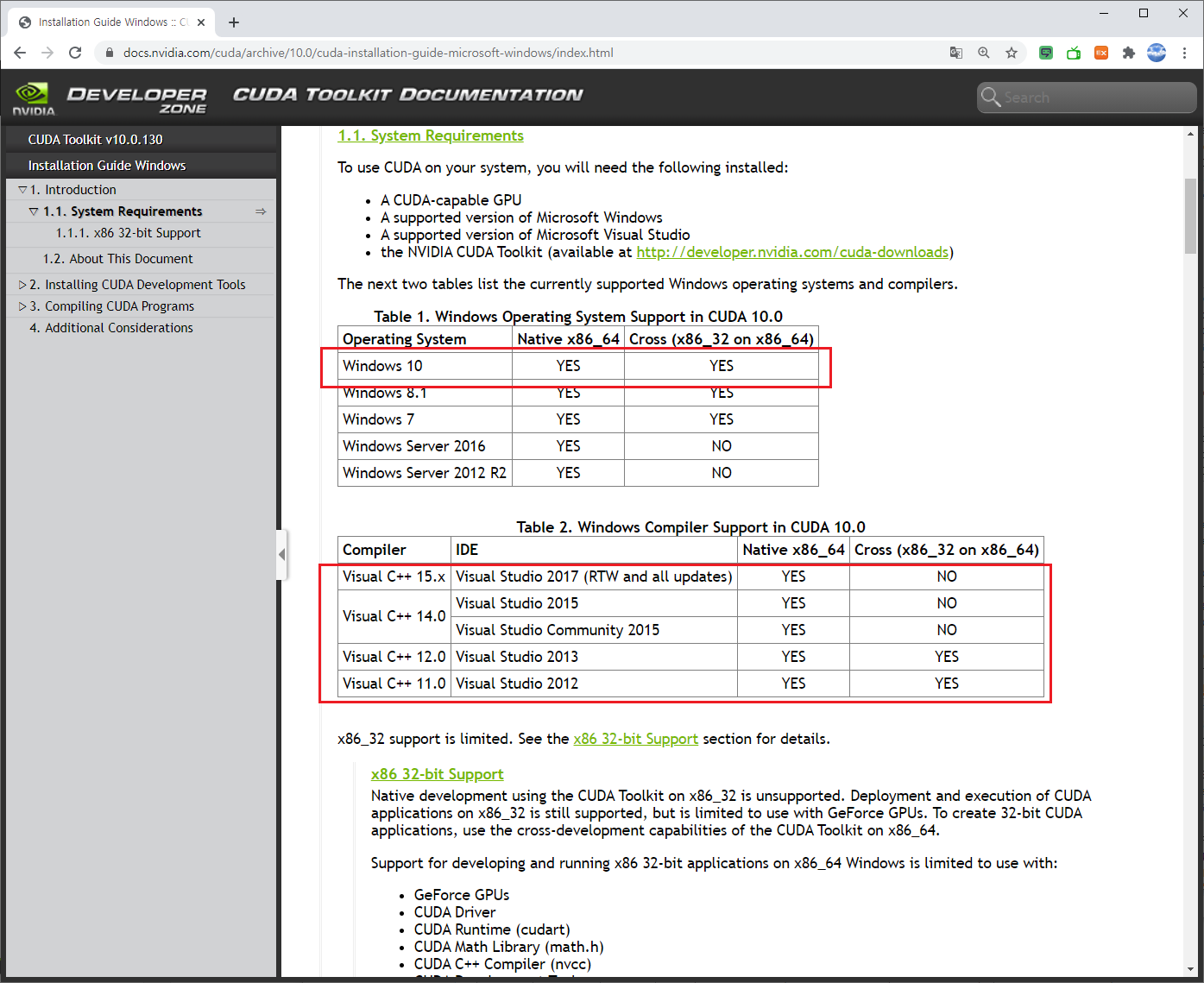 아래의 사이트에 접속하면 CUDA 최신 버전의 온라인 문서를 확인할 수 있습니다. Installation Guide windows 페이지에 접속하면 아래의 그림과 같이 설치 가능한 Windows 버전과 미리 설치해야 하는 Visual Studio 버전을 확인할 수 있습니다. 제 컴퓨터에는 Visual Studio 2019 버전이 설치되어 있습니다.
