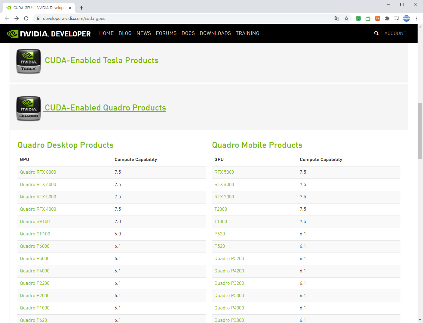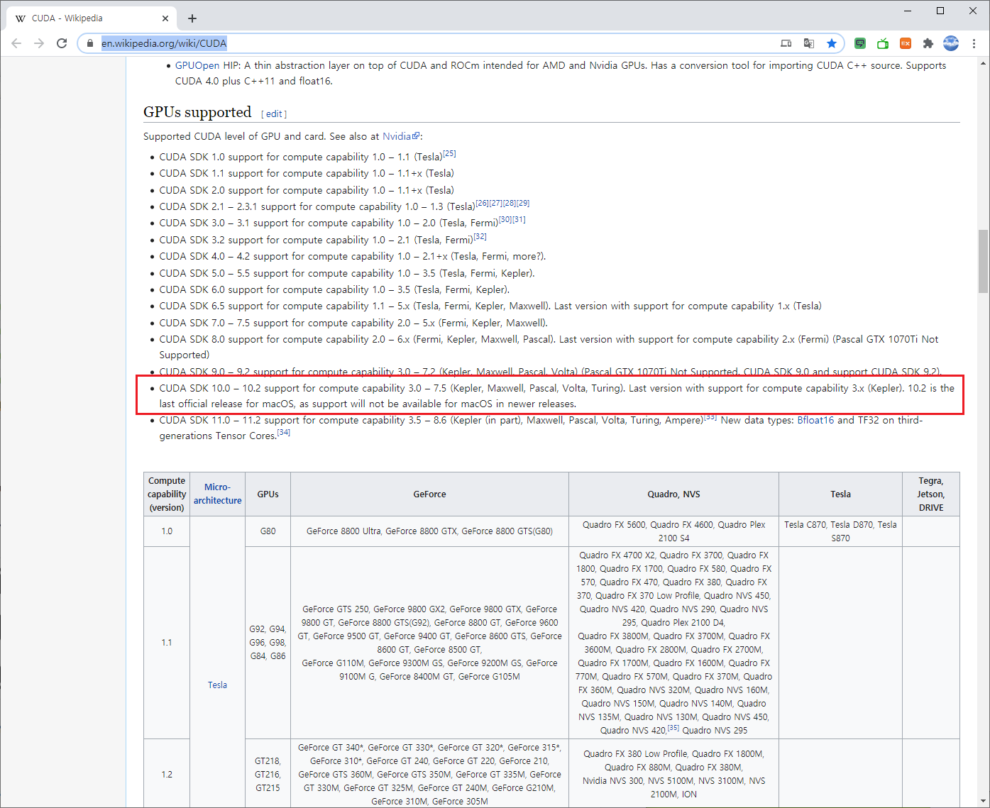 현재 컴퓨터에 설치된 그래픽 카드의 계산능력(Compute Capability)을 확인한 후 아래의 사이트에 접속하여 CUDA 버전의 호환성을 확인하시기 바랍니다.