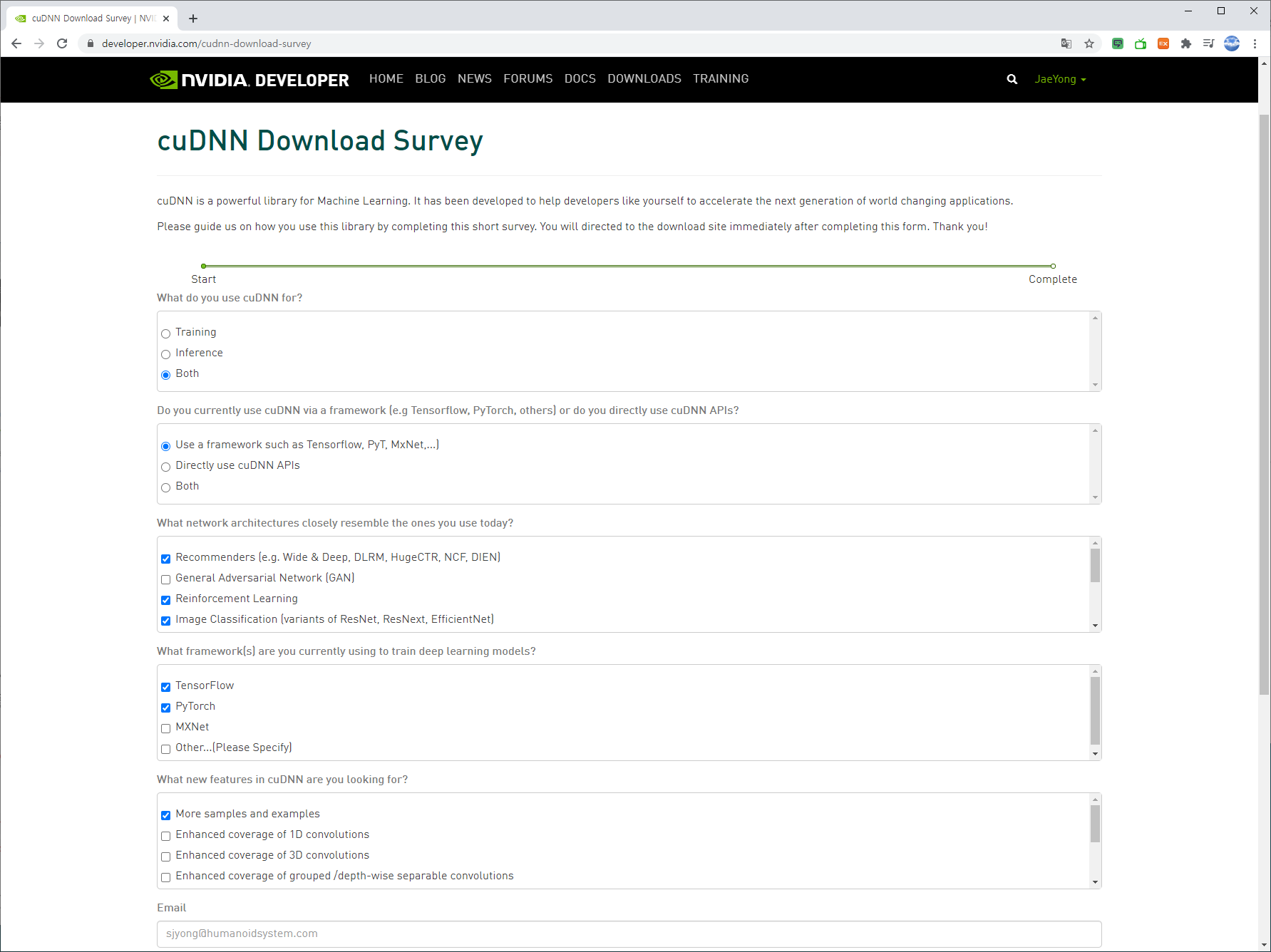 다음 페이지에 cuDNN 다운로드 설문조사를 진행합니다.