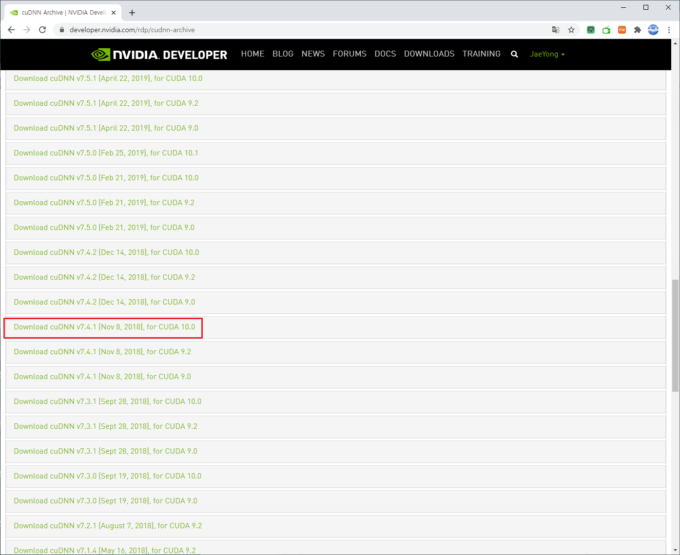 CUDA 10.0을 지원하는 cuDNN v7.4.1 링크를 클릭합니다.