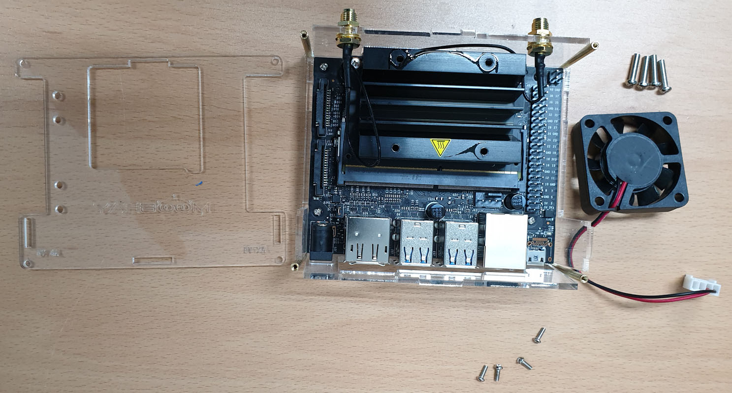 4. 아크릴 케이스의 하단 부분을 조립하고 Jetson Nano 보드를 고정합니다.