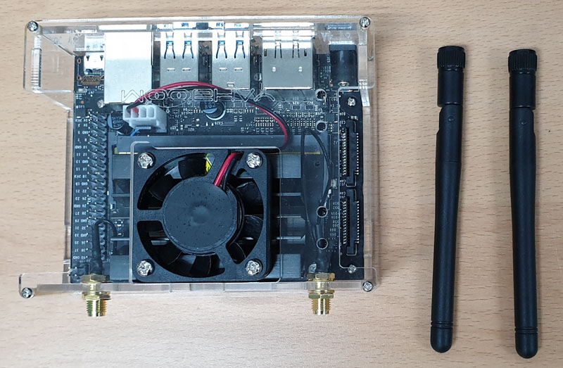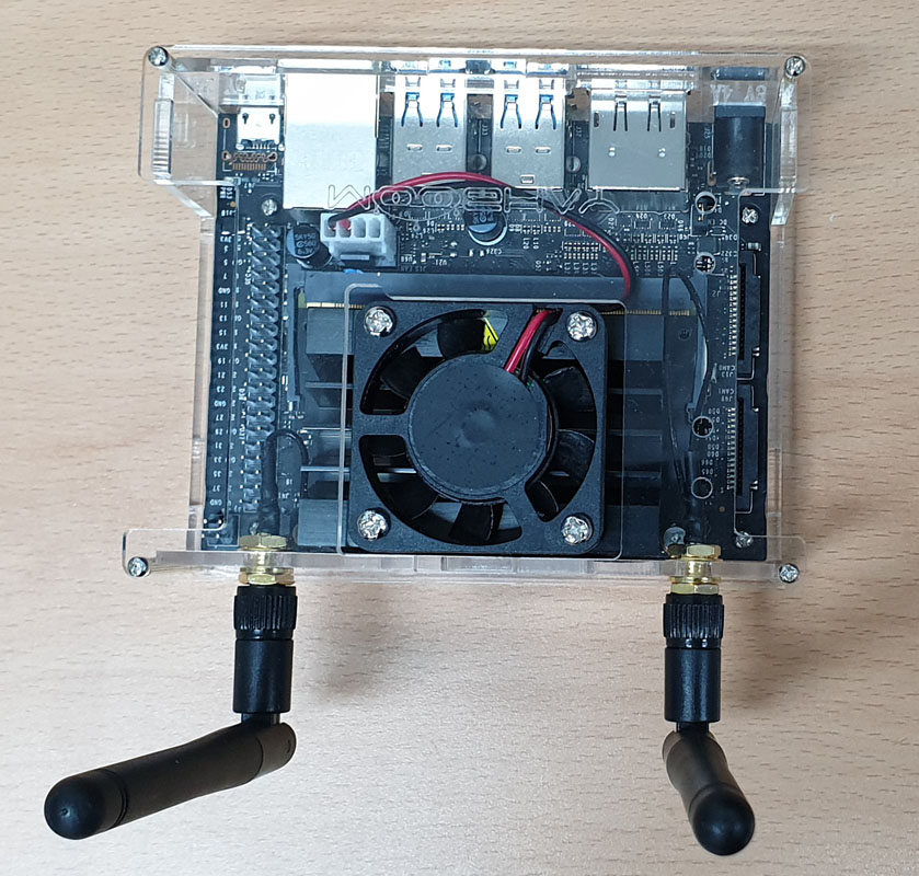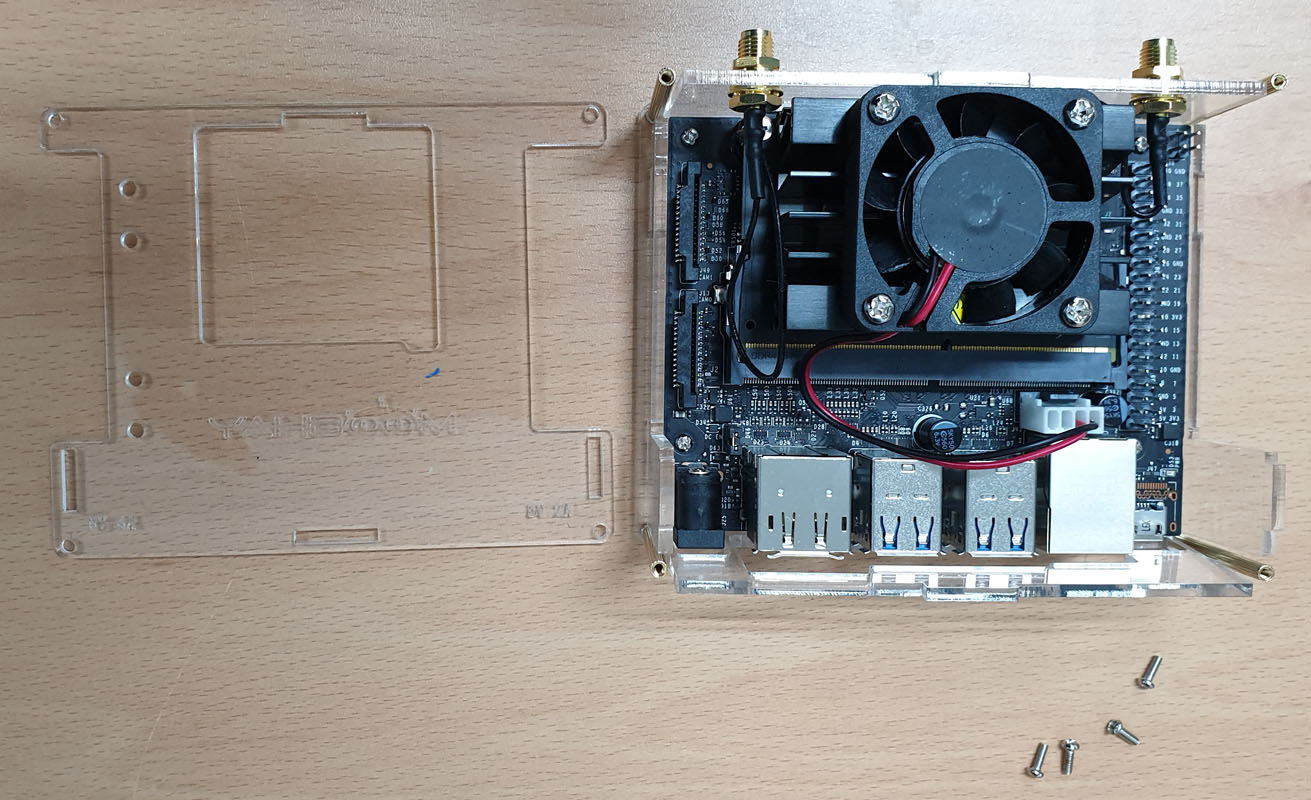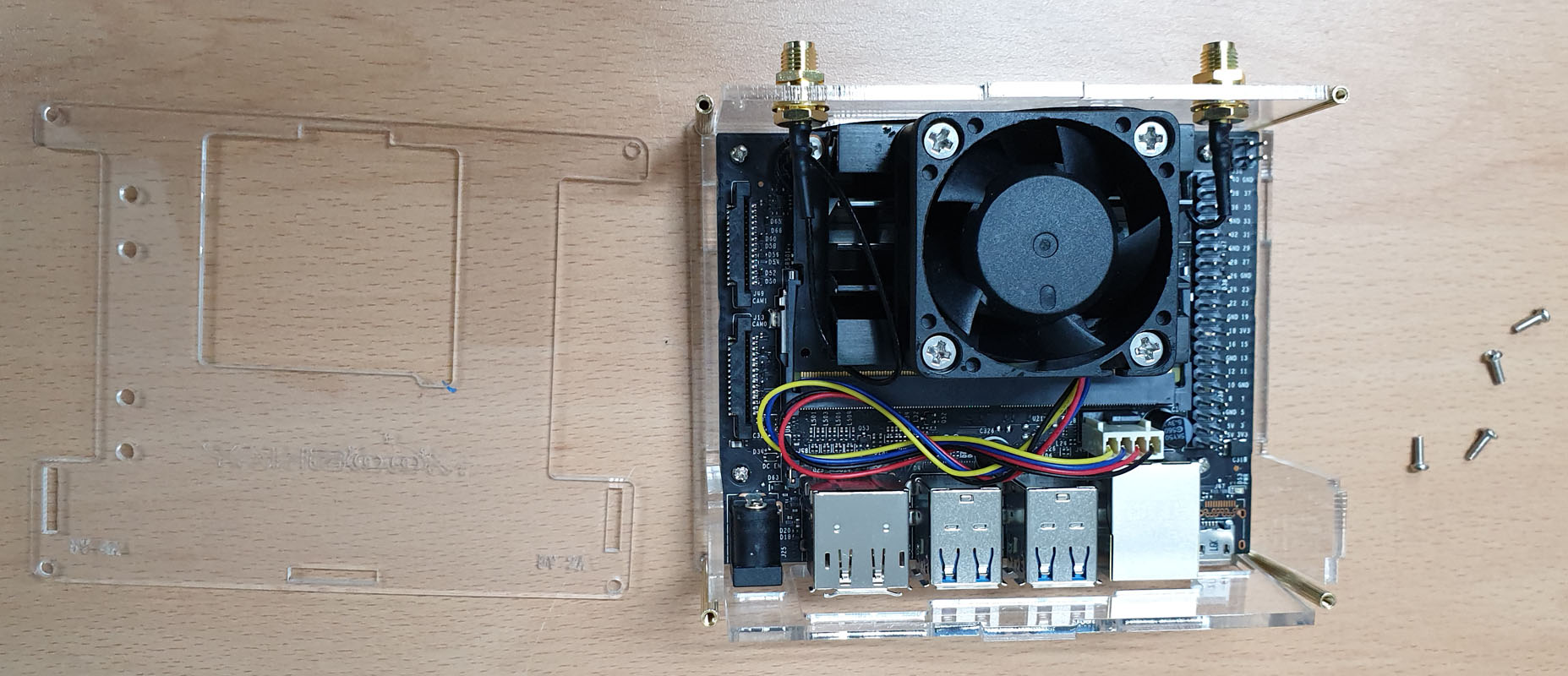 아크릴 케이스의 뚜껑을 조립하고 WiFi 안테나를 조립합니다.