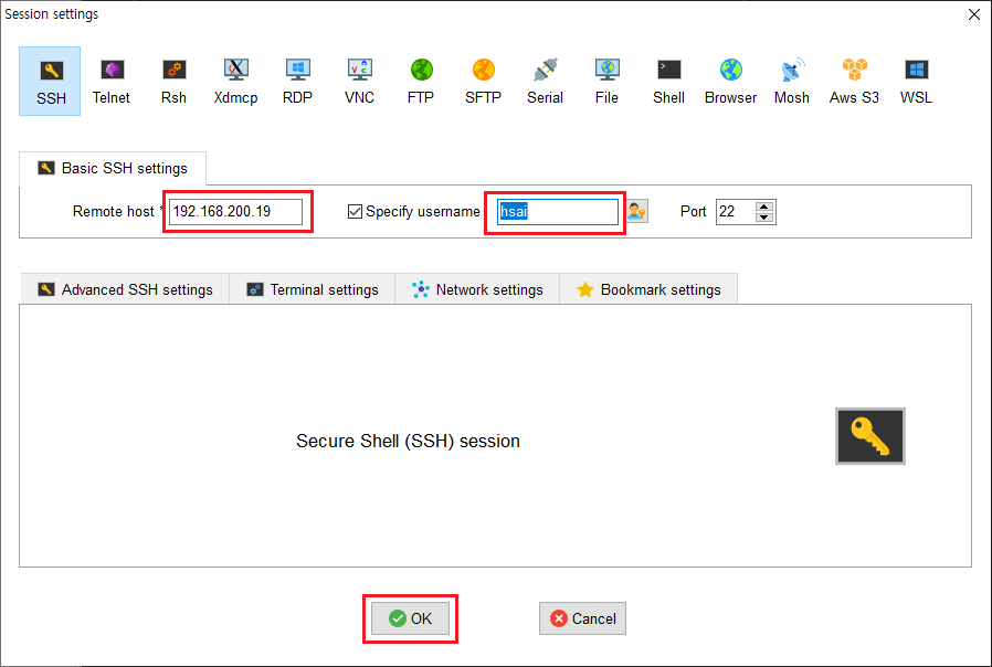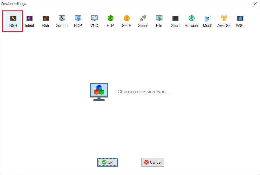 Session 메뉴의 SSH를 이용하여 원격 호스트에 연결합니다. 아래의 그림과 같이 상단 좌측의 Session 아이콘을 클릭하면 아래의 그림과 같이 Session 선택 창이 나타나고, 여기에서 SSH 아이콘을 클릭합니다.