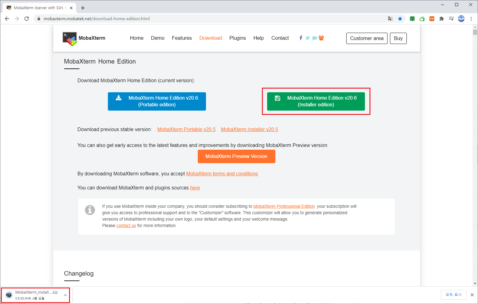 Home Edition 페이지의 우측에 있는 "MobaXterm Home Edition" 버튼을 클릭하여 설치 파일을 다운로드합니다.