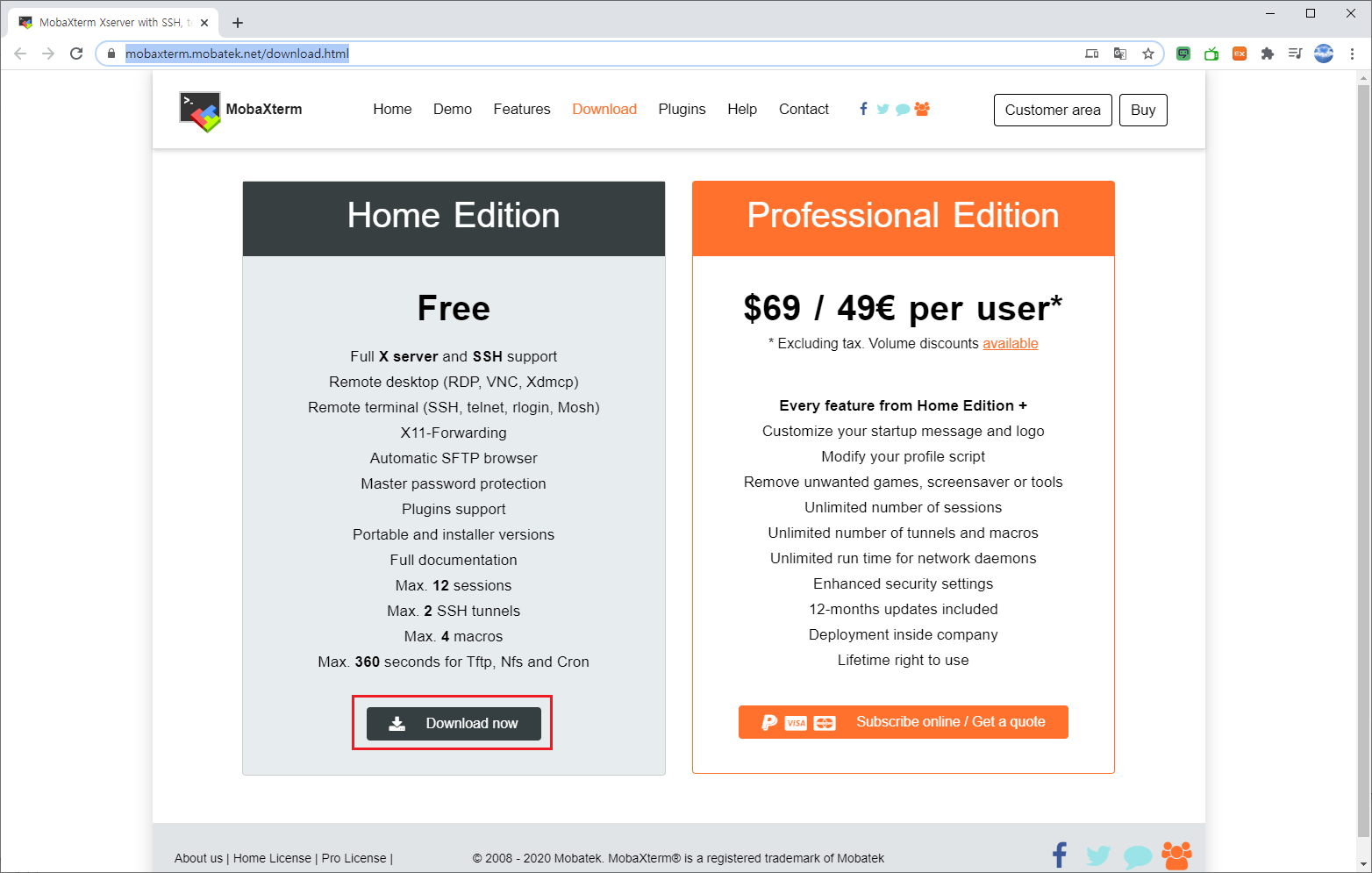 무료인 Home Edition의 "Download now" 버튼을 클릭합니다. 무료 버전은 사용에 제약(최대 12 Session, 2 SSH Terminal, 4개의 매크로, 360초 Tftp 등)이 있지만 사용하시기에는 크게 불편하지 않을 것입니다.
