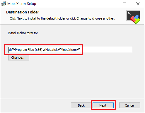 설치 위치를 변경하고자 할 경우, "Change" 버튼을 클릭하고 원하는 폴더를 지정합니다. 수정하지 않을 경우 "Next" 버튼을 클릭합니다.