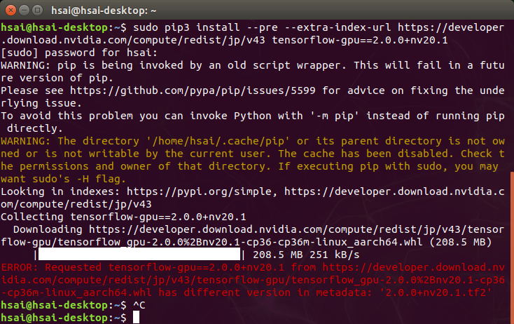 sudo pip3 install --pre --extra-index-url https://developer.download.nvidia.com/compute/redist/jp/v43 tensorflow-gpu==2.0.0+nv20.1