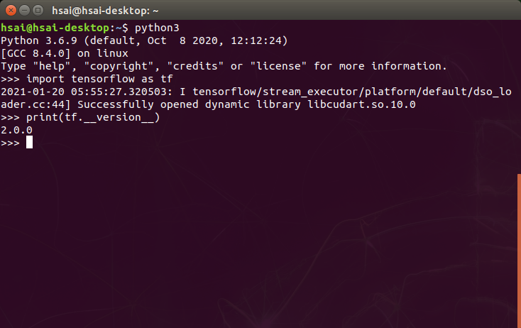 아래의 그림과 같이 tensorflow의 버전이 2.0.0으로 출력되면 정상적으로 설치가 완료된 것입니다.